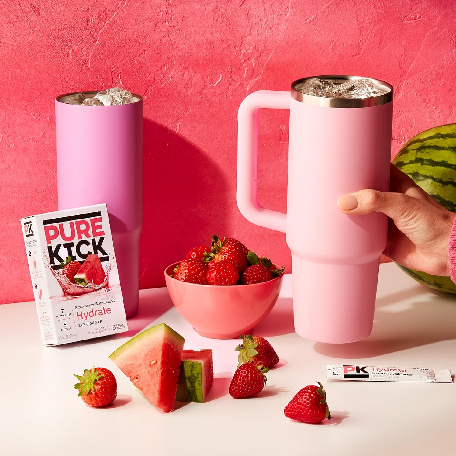 Introducing Pure Kick Hydration Singles To Go Drink Mix, the perfect way to enjoy a refreshing and delicious beverage on the go. Our Strawberry Watermelon flavor is a delightful blend that will tantalize your taste buds and keep you hydrated throughout the day.